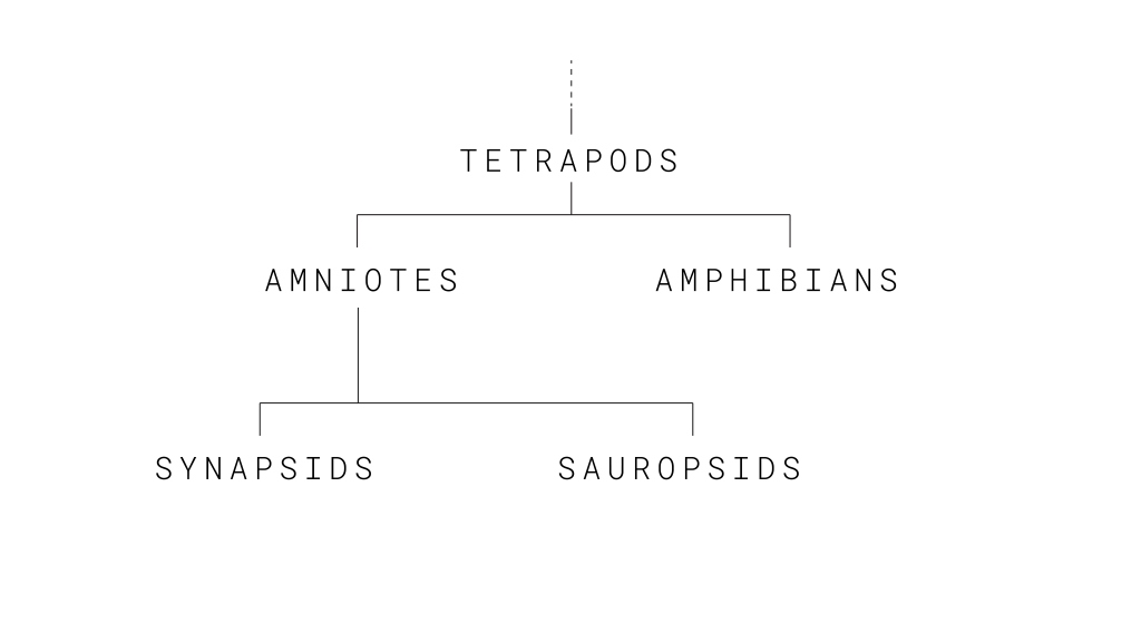 Shortly after the split of synapsids and sauropsids, the Carboniferous Period came to an end with an extinction event called the Carboniferous Rainforest Collapse which also signalled the beginning of the next Period, the Permian. The rainforest collapse is significant in that it reduced the previously sprawling rainforests to isolated pockets with the land in-between being dry and arid. Here the amphibians, once the dominant force, faltered. Desiccation in the glaring sunlight meant they could not travel between the fragmented patches, and many went extinct. The amniotes, however, true to their boy scout training of always being prepared, diversified, and flourished.
